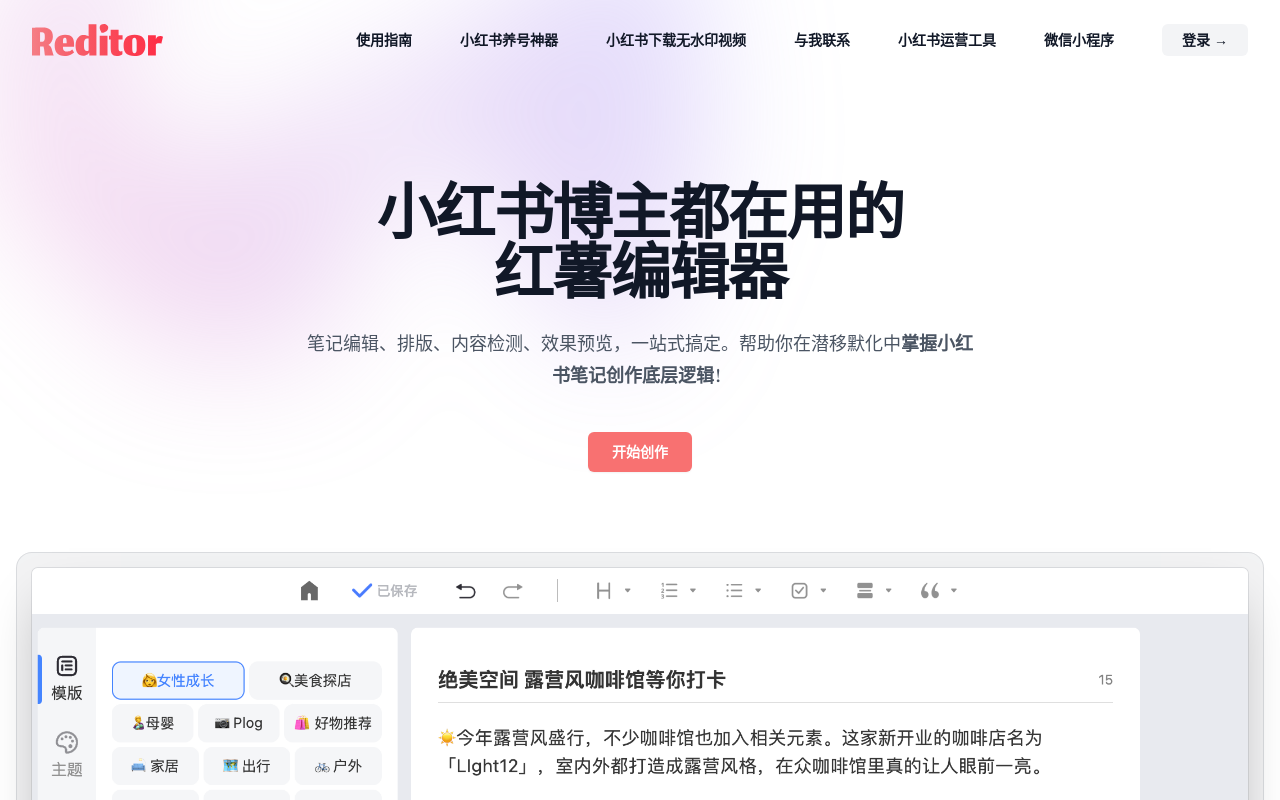 Reditor编辑器(原名红薯编辑器)是专为小红书内容创作者和运营者设计的工具平台。它提供AI文案生成、违禁词检测、Emoji排版、笔记编辑和运营干货等功能,帮助用户高效创作合规且吸引人的笔记,提升内容质量和运营效率。