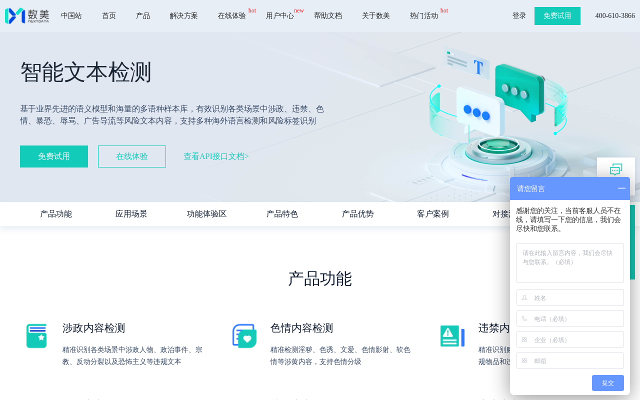 数美科技的智能文本检测服务,利用AI语义模型和多语言样本库,帮助企业自动识别涉政、色情、暴恐、辱骂等违规内容。适用于社交媒体、电商、直播等平台,提供高效的内容过滤与安全防护,支持API集成。