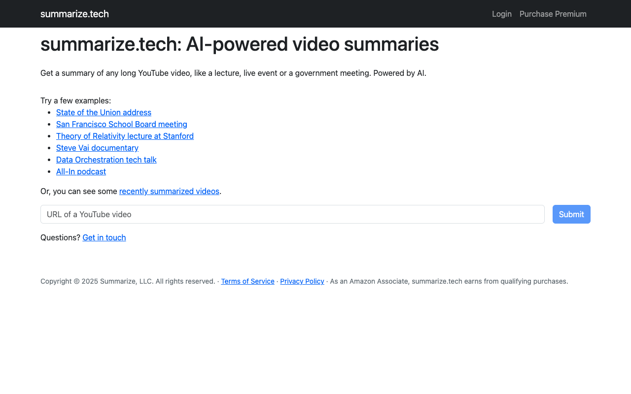 Summarize.tech是一款专注于为YouTube长视频生成AI摘要的工具。它能自动分析学术讲座、行业会议、播客等长视频内容,提炼关键观点与逻辑脉络,输出结构化摘要。无需完整观看视频,即可快速掌握核心信息,适合学生、研究者和职场人士高效获取知识。