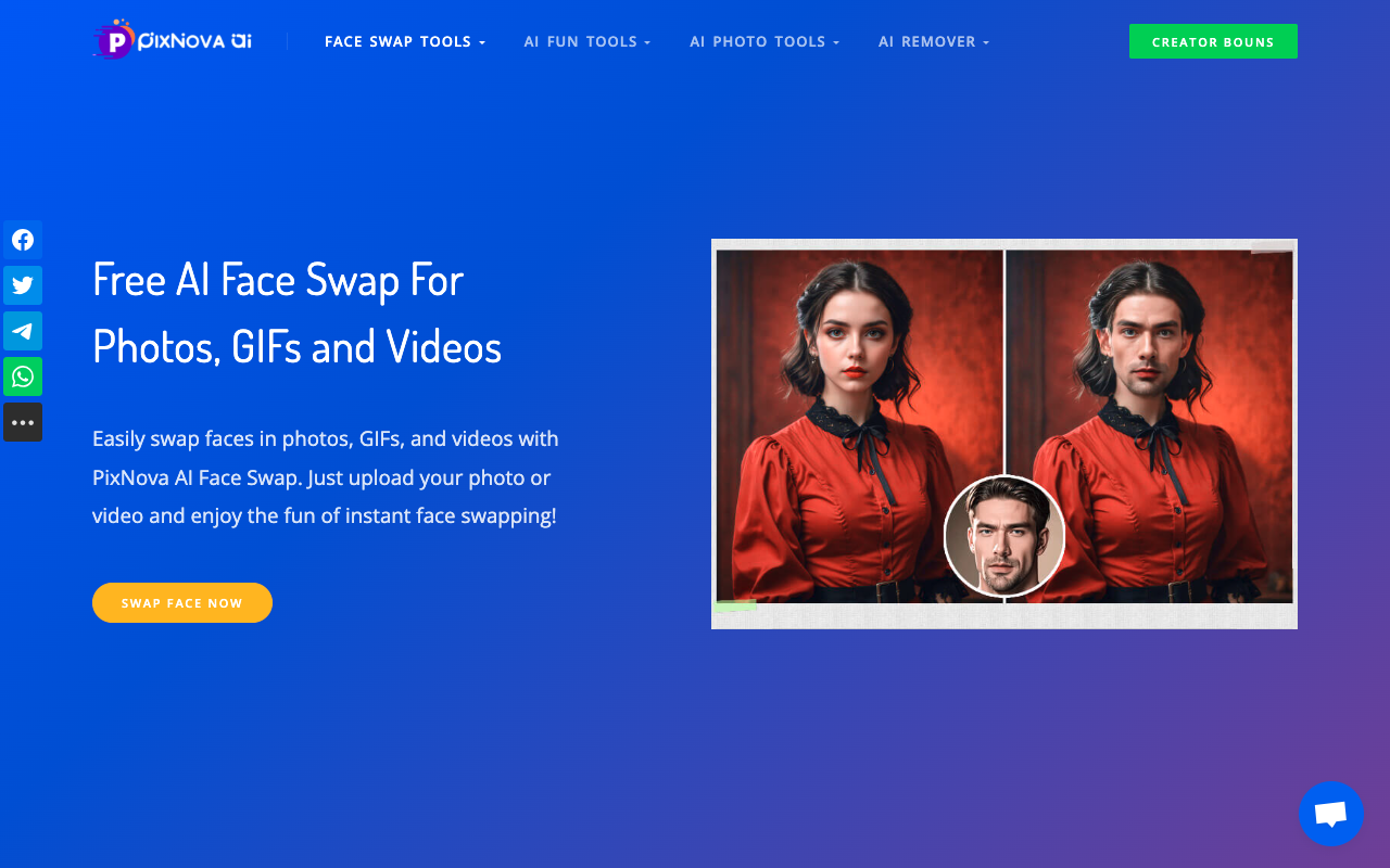 Pixnova.ai 是一个在线平台,专门用人工智能技术处理图像和视频。它的看家本领是 AI 人脸交换,能让你把一张脸精准地放到另一张照片或视频里的人身上,效果相当逼真。