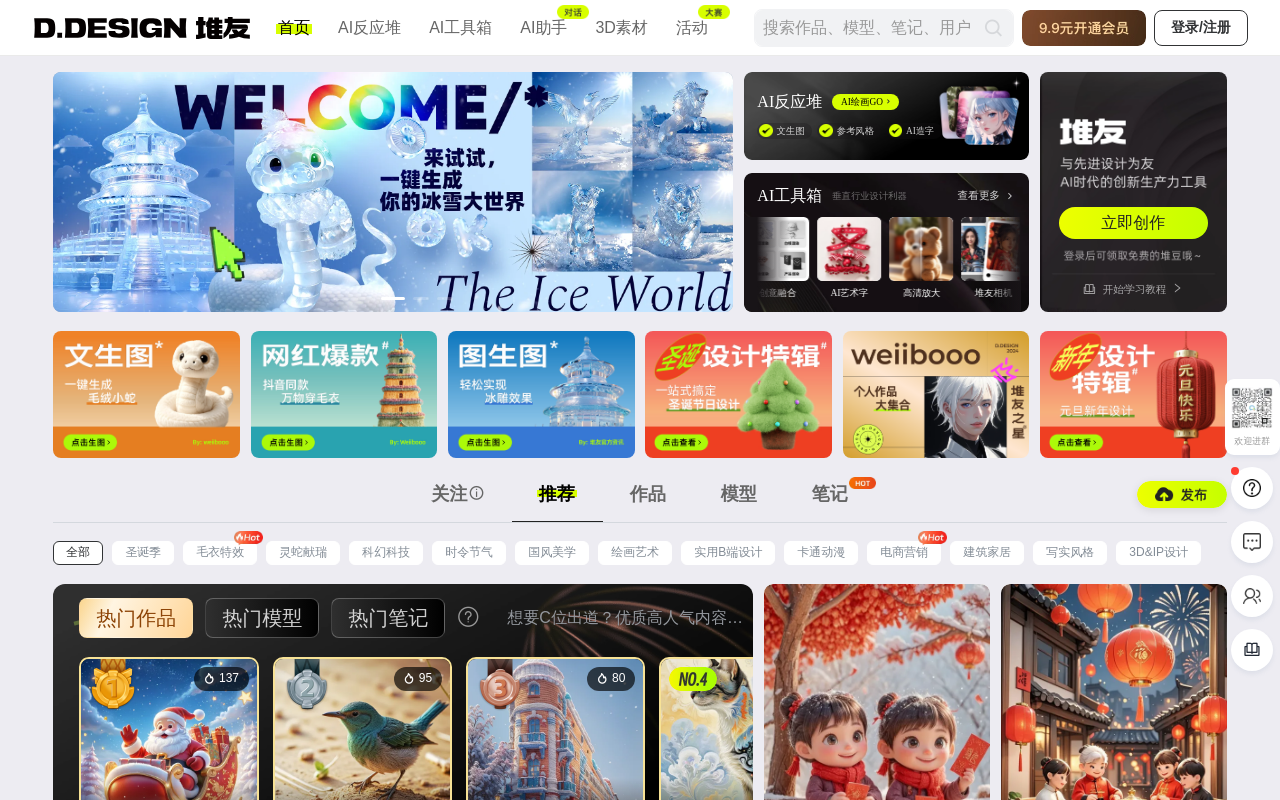 堆友(D.design)是阿里巴巴设计团队推出的设计师服务平台,提供3D素材、在线设计工具和资源库。平台围绕品质、效率、技能、成就和收入,整合了从素材获取到设计落地的完整方案。