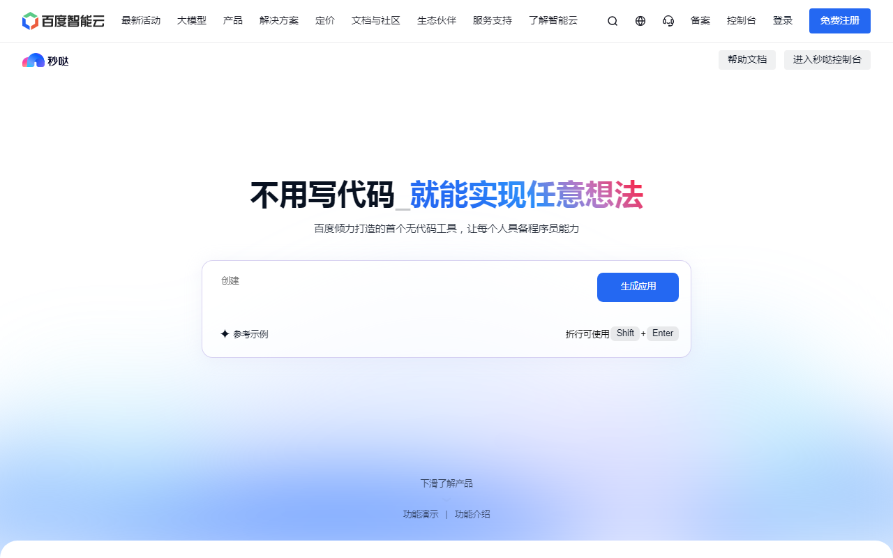 秒哒(Miaoda)是百度智能云在2024年底推出的生成式应用开发平台。它的核心很简单:你告诉它你想要什么应用,它帮你做出来,不用写一行代码。平台基于百度的文心大模型,通过自然语言对话和多个AI智能体的分工协作,把开发应用的门槛降到了最低。