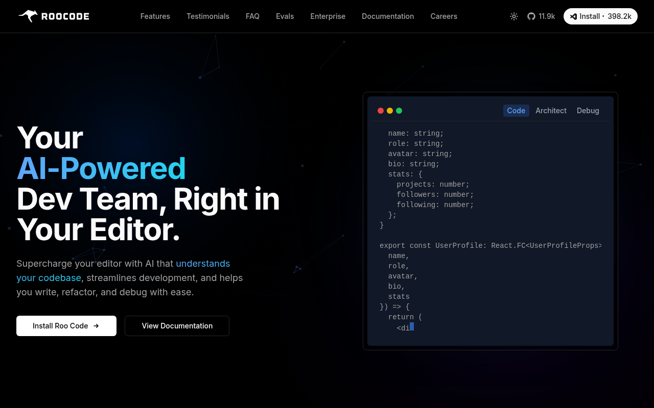 RooCode是一个开源的、AI驱动的编码辅助工具,旨在通过集成到代码编辑器(主要是Visual Studio Code,简称VS Code)中,为开发者提供一个强大的“AI开发团队”。它不仅仅是一个简单的代码补全工具,而是通过多文件编辑、自动化任务执行和高度可定制的功能,模拟一个完整的开发团队的工作流程,帮助开发者更高效地完成编码、调试、测试和架构设计等任务。
