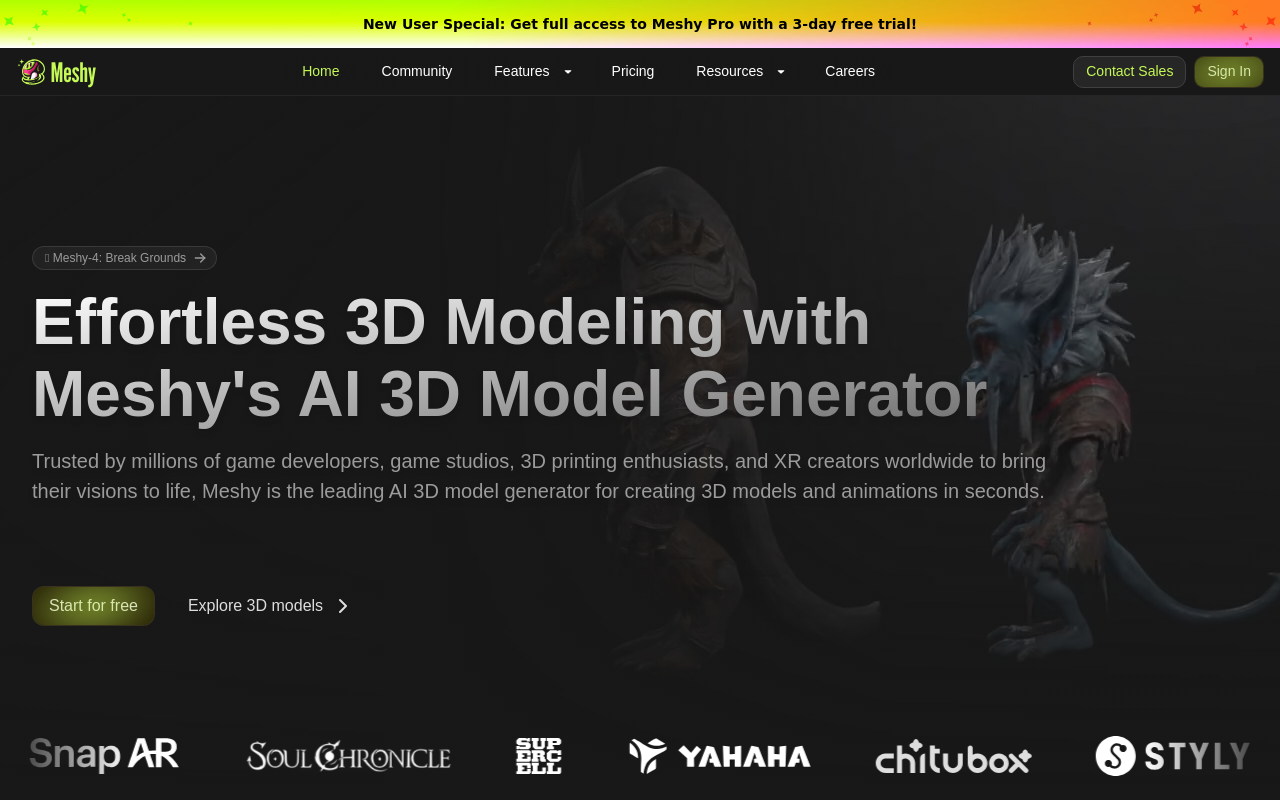 访问Meshy官网注册账号就能用。新用户有免费额度,大概能生成4-5个模型。操作流程很简单:登录后选择“文字生成”或“图片生成”,输入描述或上传文件,稍等片刻就能看到结果。网站还提供了详细的教程和活跃的Discord社区,遇到问题可以随时提问。