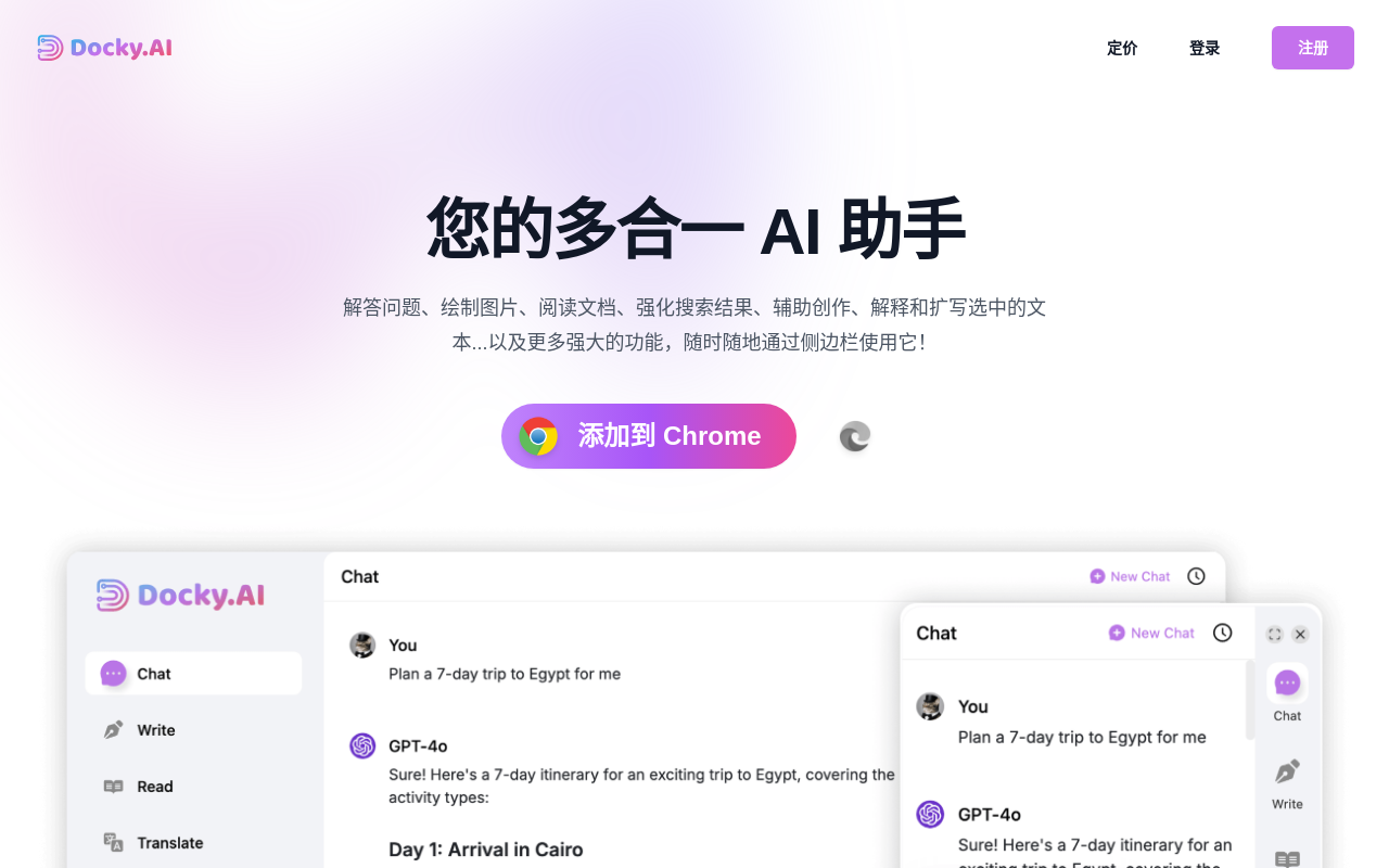 Docky AI 是一个集成了GPT-4o、DALL-E3等多种模型的智能平台。它能总结网页、解析PDF/PPT文件、进行图像识别,并支持通过AI群聊功能让多个模型协同工作。适用于学术研究、内容创作、商务办公等需要高效处理文本、图像与多语言任务的场景。提供浏览器插件,有免费和订阅版本可选。