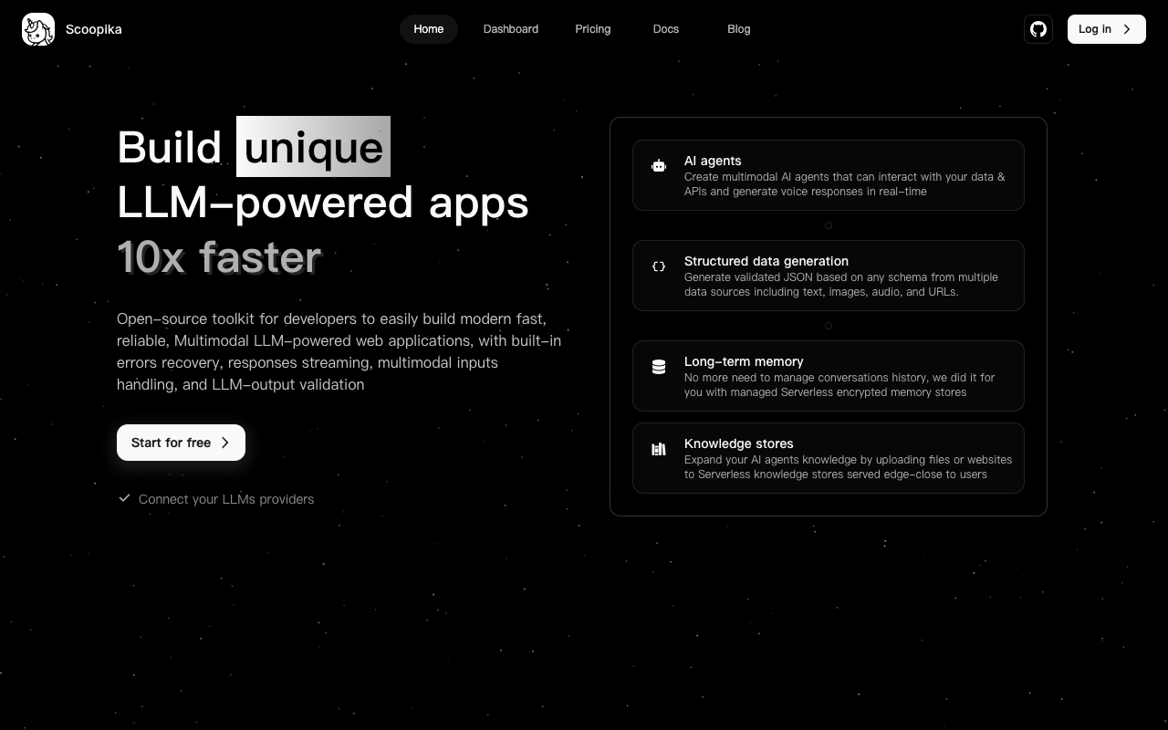 Scoopika官网)是一个开源平台,它基于大型语言模型,专门给开发者提供工具,用来打造能看、能听、能说、能协作的多模态AI代理和智能助手。