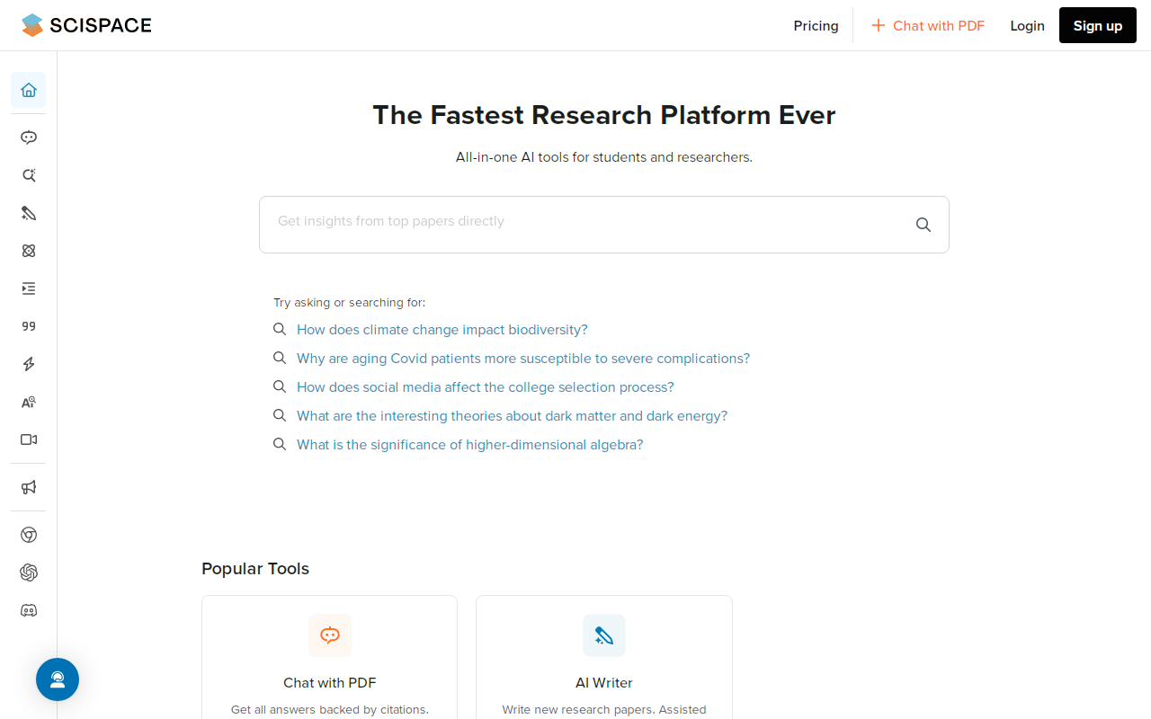 SciSpace(原名 Typeset.io)是一个由人工智能驱动的学术研究平台,主要服务于研究人员、学生和学者。它的目标是通过AI技术,帮助用户更高效地发现、理解、阅读乃至创作科研论文,从而让整个研究过程变得更顺畅。