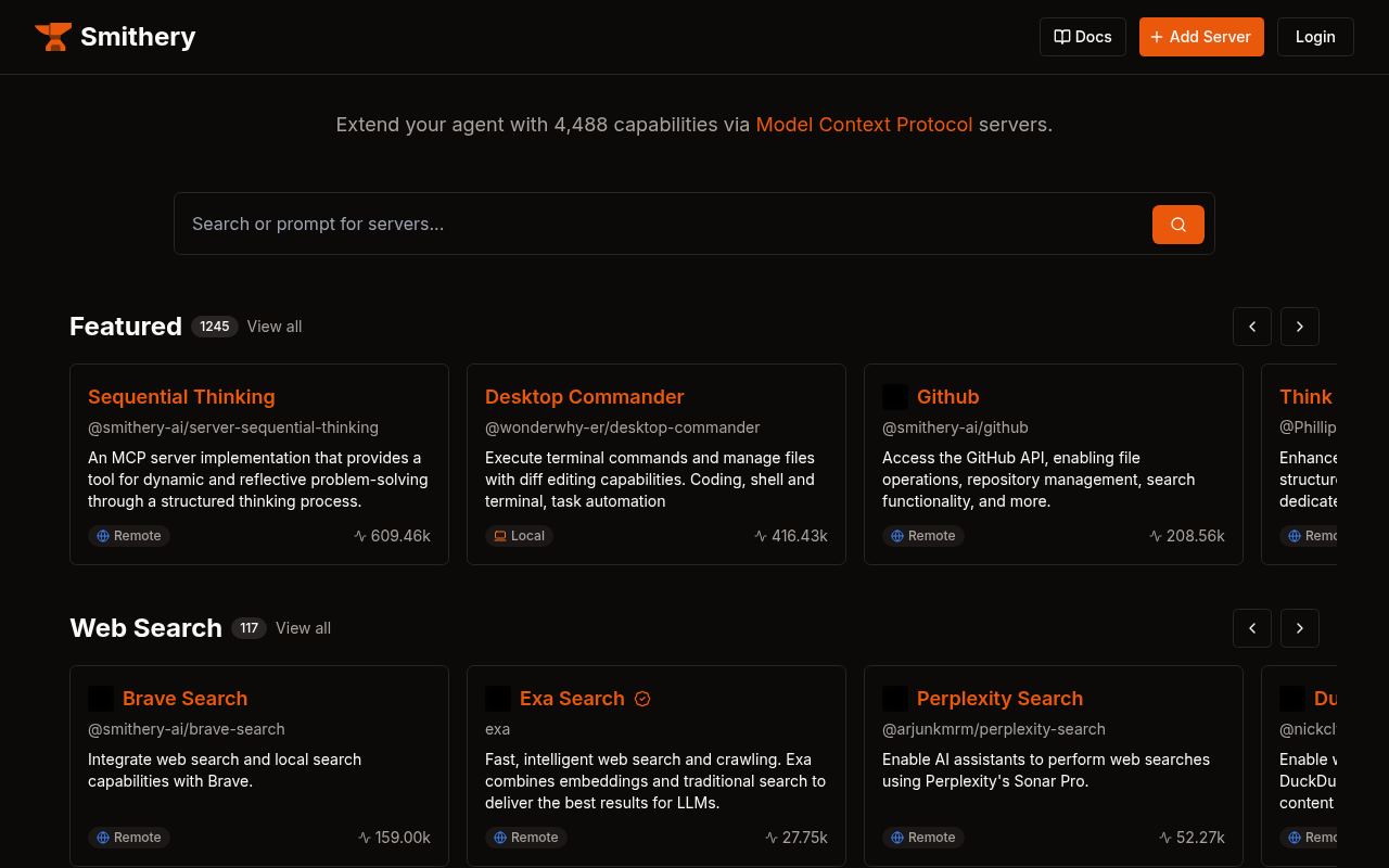 这里像个工具超市,货架上摆着超过4400种不同功能的MCP服务器。你需要GitHub操作?有。想实时搜索网页?有。甚至想控制云端浏览器或者连接你的Obsidian笔记库?都有。开发者可以直接搜索关键词找到需要的工具,不用再从零造轮子。
