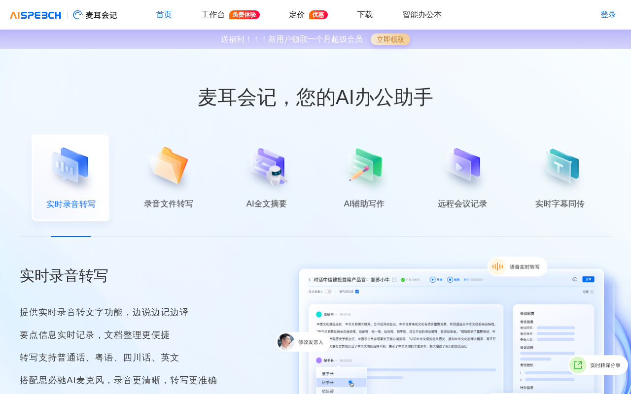 • 实时录音转写:一边开会一边就把语音转成文字,支持普通话、粤语、四川话和英文。