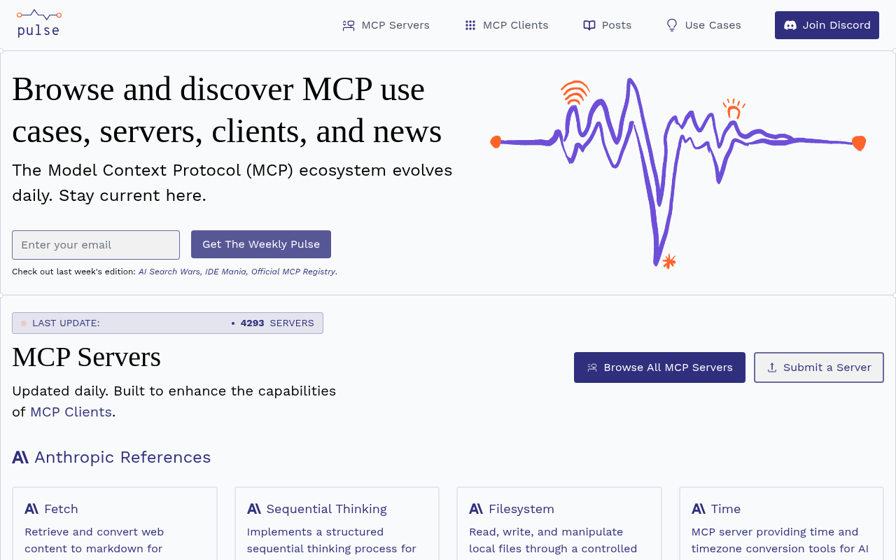 这是PulseMCP的招牌功能。它维护着一个每日更新的MCP服务器目录,截至2025年5月,已收录超过4290个服务器。你可以把它想象成一个功能强大的“应用商店”,但里面卖的不是App,而是能让AI调用外部能力的“连接器”。