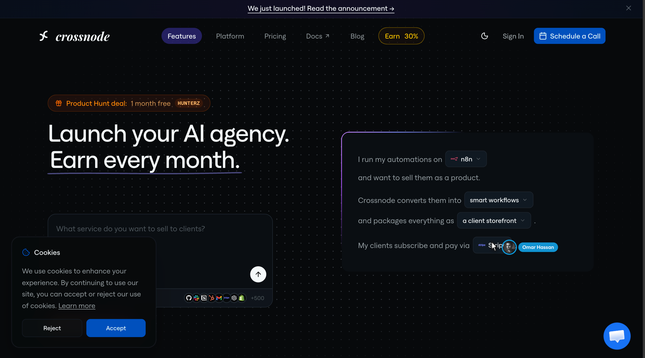 想开一家AI代理服务公司,但觉得技术门槛高、流程太复杂?Crossnode.sh 就是来解决这个问题的。它把你脑子里那些自动化工作流的想法,变成能按月收钱的AI产品,从找到第一个客户到月入过万,都能在这个平台上搞定。最棒的是,不用信用卡也能免费开始玩。