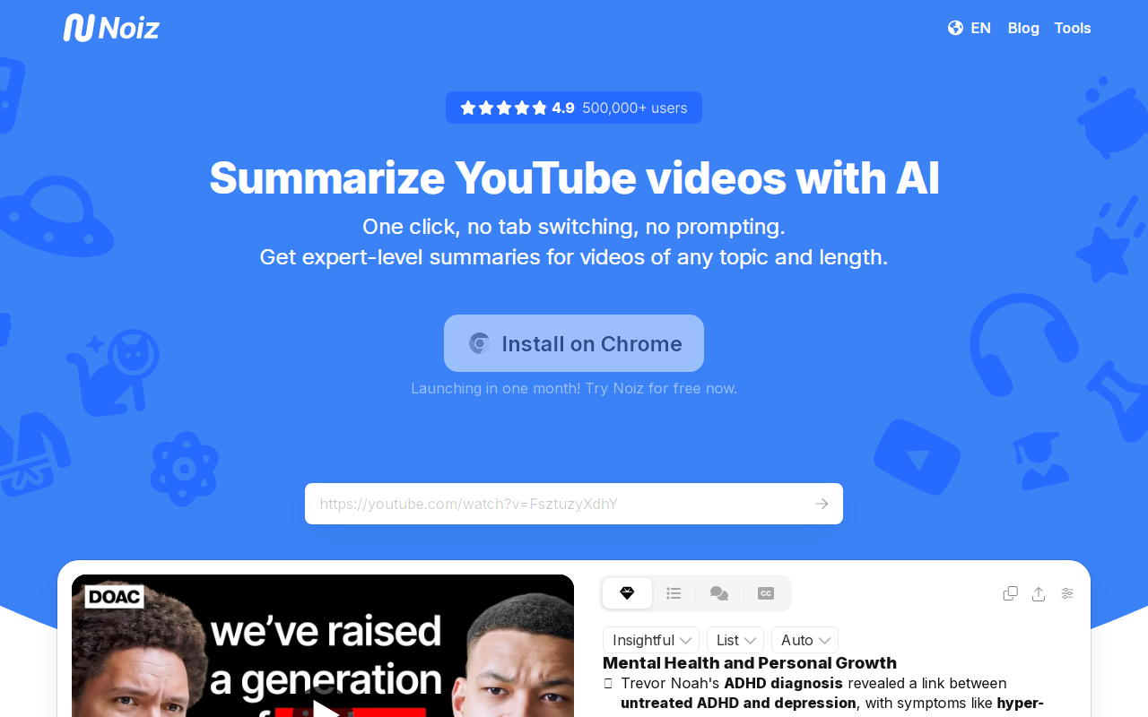 Noiz.io是一个在线工具,专门帮你总结YouTube视频。它像个贴心的助手,在你不想花几个小时看完整段教程、播客或纪录片时,点一下按钮,它就能用人工智能把核心内容提炼出来,变成几分钟就能读完的文字摘要。