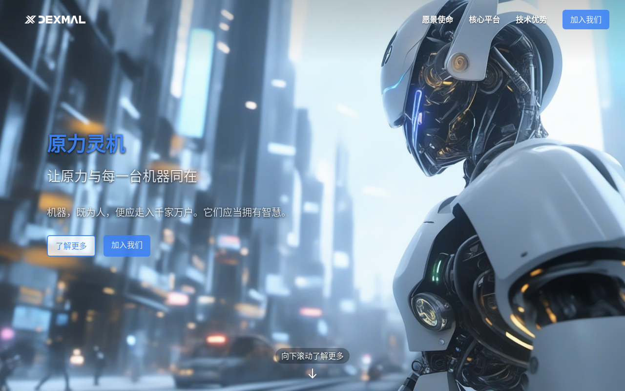 打开 https://dexmal.com/,你看到的是原力灵机(Dexmal)的官方网站。这家公司干的事挺酷,他们专攻“端到端具身智能大模型”,简单说,就是想办法让机器人变得更聪明、更灵巧、更可靠,最终目标是让智能机器人能真正走进千家万户,帮你干点活。