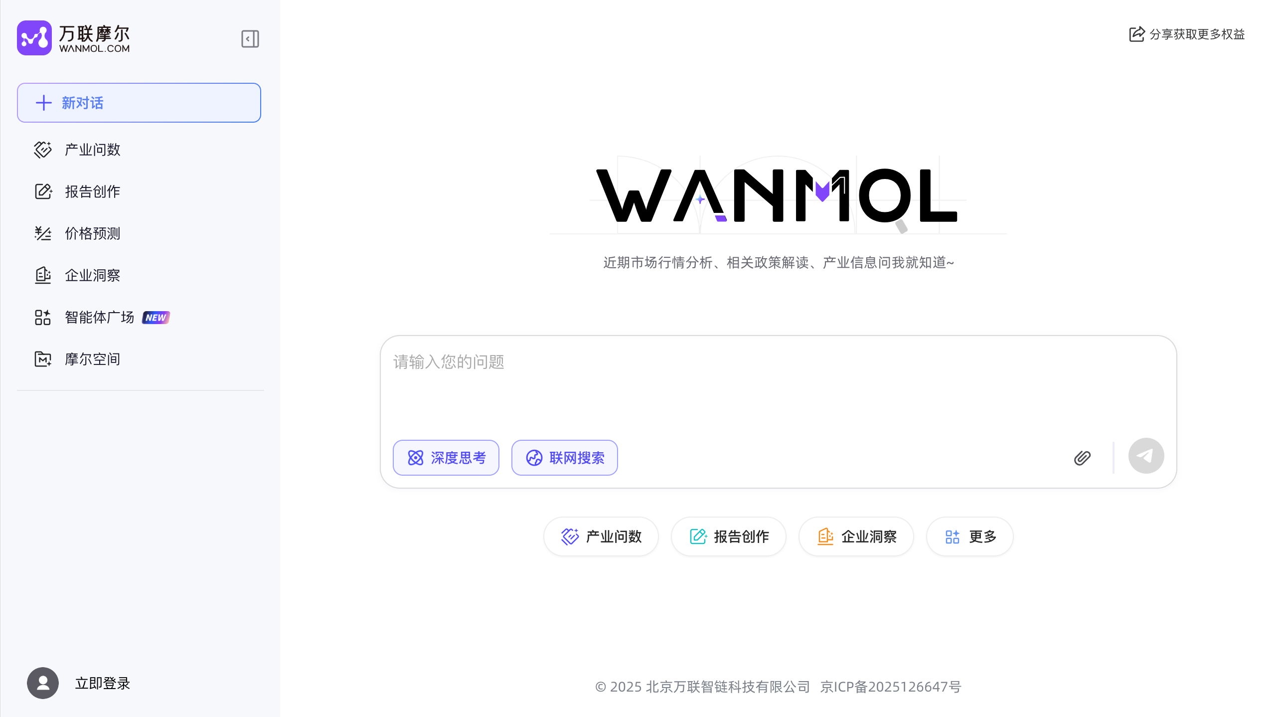 万联摩尔的目标是“让AI与产业双向奔赴”。它通过整合高质量的市场数据、真实的业务数据和垂直的产业逻辑,推动AI从简单的对话能力,向“懂产业、能决策”的方向升级。平台主要服务于金融分析师、政策研究员、企业战略规划者等专业人士,帮助他们应对数据碎片化、报告创作耗时等产业痛点,提升工作效率。