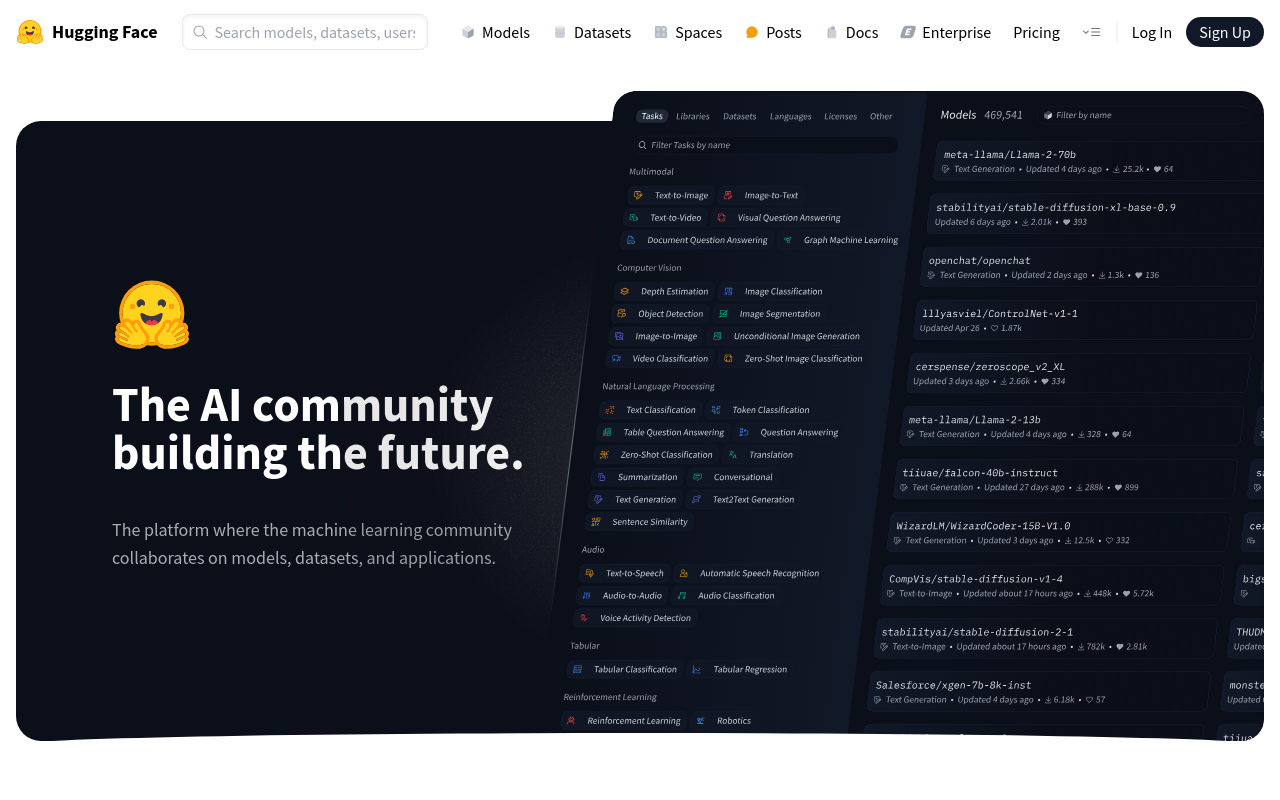 • 模型:托管了超过90万个开源模型,涵盖自然语言处理(如文本生成、翻译)、计算机视觉(如图像分类、生成)、音频处理(如语音识别)等多种任务。像BERT、GPT-2、Stable Diffusion这些热门模型都能在这里找到。