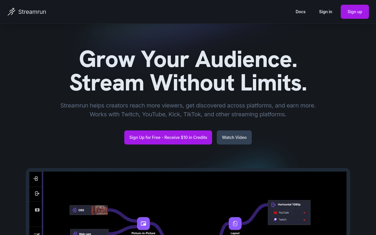 Streamrun 是一个云端多平台直播解决方案,充当直播视频源(如 OBS、GoPro、手机)和目标平台(如 Twitch、YouTube、Kick)之间的中间层。它允许用户通过云端处理视频流,添加高级功能(如噪声消除、断线保护)和自定义配置,从而提升直播体验。Streamrun 的核心目标是让直播主能够以更低的成本、更高的灵活性实现专业级的直播效果,同时支持多平台同时串流。