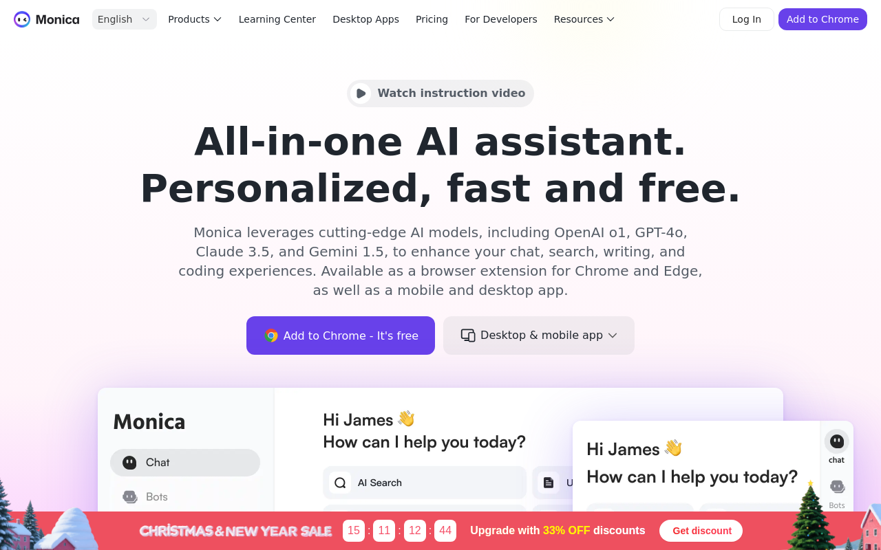 Monica.im是一款基于ChatGPT API的浏览器扩展,无需登录即可使用。它提供聊天机器人、网页增强搜索、AI写作、PDF对话、视频总结等丰富功能,通过快捷键快速调用,帮助用户高效处理文案、学习、编程等日常任务。