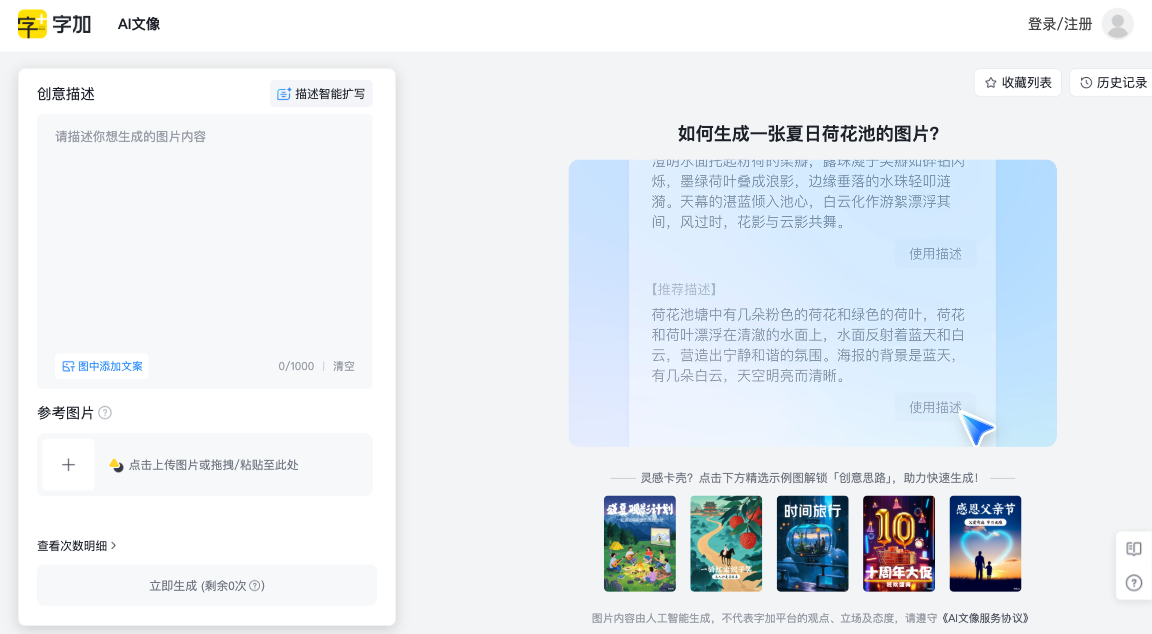4. 添加参考(可选):可以上传一张图作为风格参考,或者加上想出现在图里的文字。