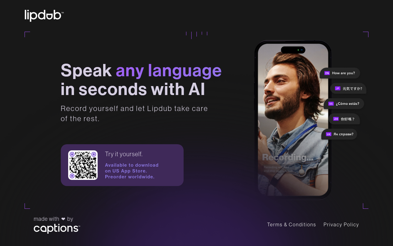 Lipdub是一款AI视频翻译应用,可将你的视频实时翻译成27种语言,并同步调整唇部动作,让配音看起来自然真实。适合内容创作者、教育者制作多语言视频,操作简单,目前免费使用。