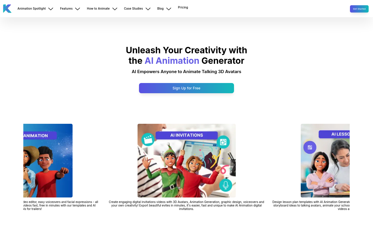 Krikey AI是一个AI驱动的3D动画制作平台。它让动画创作变得简单:输入文字描述或上传视频,AI就能生成动画角色和动作。你可以定制角色外观、添加多语言配音、更换场景,并用于教育课件、营销视频或社交媒体内容。无需动画基础,几分钟就能上手。