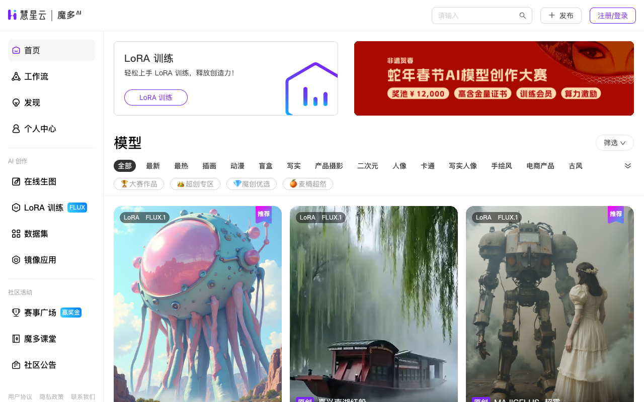 魔多AI(慧星云)是一个面向创作者的AI生产力平台,提供在线AI绘画生图、LoRA模型训练、ComfyUI工作流搭建、AI课程学习与赛事参与等一站式服务。在这里,你可以学习AI知识,实践创作,参与比赛,并与其他创作者交流分享模型与资源。