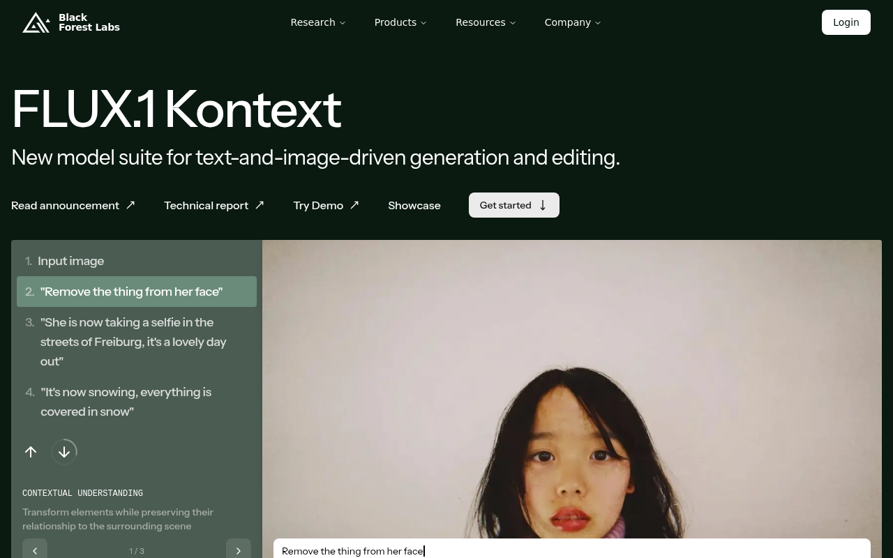 • FLUX.1 Kontext:这是一款上下文感知的图像生成和编辑模型。你可以输入文本和图片,让AI在保持角色或风格一致的前提下,生成新场景或进行局部修改,编辑速度比传统方式快不少。