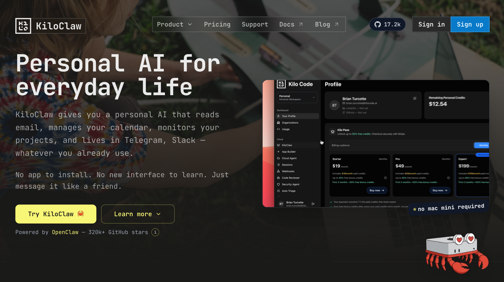 KiloClaw的核心是让高端自动化能力变得人人可用。它基于在GitHub上有32万颗星的开源项目OpenClaw打造,但把所有技术难题都打包解决了。