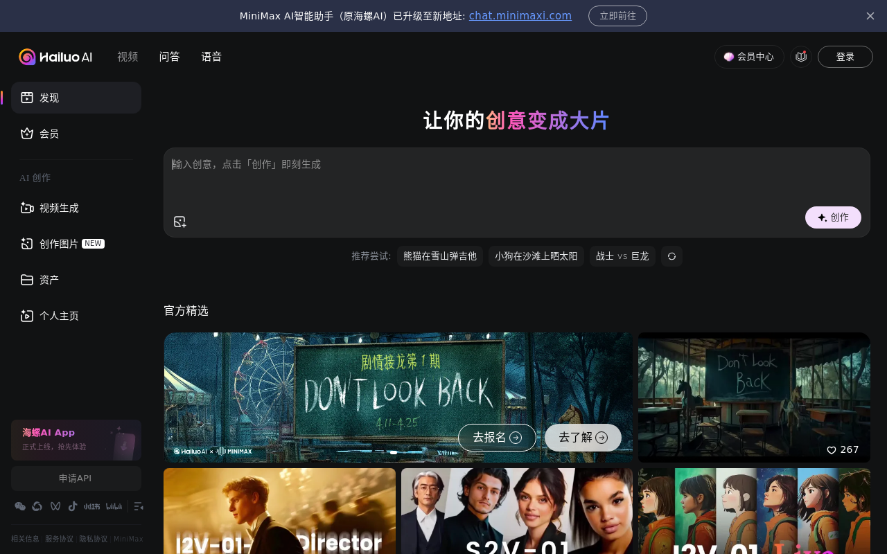 海螺AI是MiniMax公司推出的AI视频生成工具,可将文字描述或静态图片快速转化为6秒短视频。平台支持中文提示、多种画面比例和相机运动控制,适用于社交媒体内容创作、教育演示和艺术表达。无需注册即可免费试用,生成视频无水印。