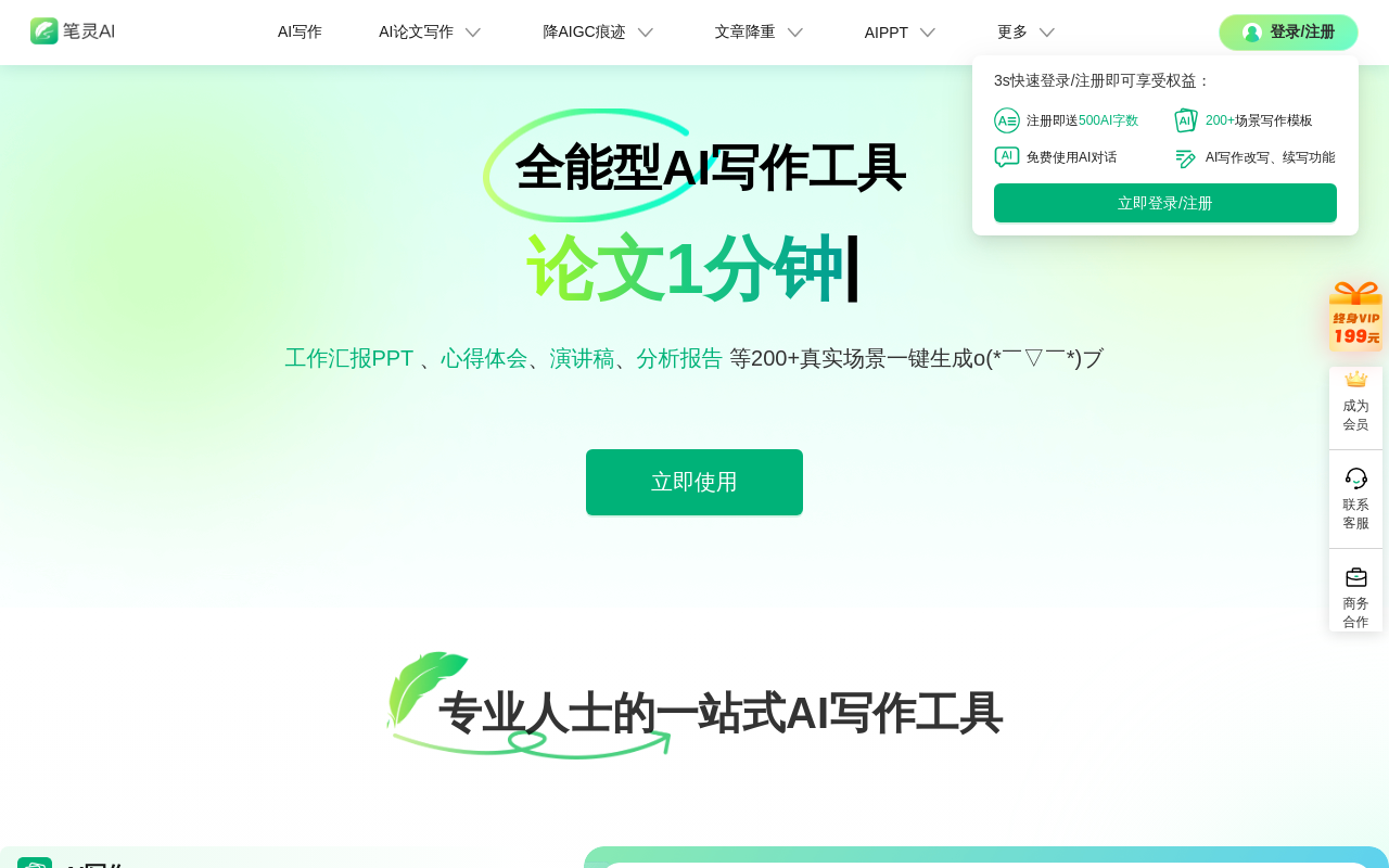 界面设计简洁,不需要任何专业知识就能快速开始使用。注册后可以免费体验基础写作和改写功能,高级功能如论文降重、PPT生成则需要开通会员。