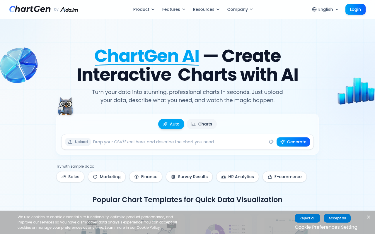 想做个图表,是不是总卡在Excel公式或者设计软件里?ChartGen AI就是来解决这个麻烦的。它是个用AI帮你画图的工具,你只需要把CSV或Excel文件拖进去,或者直接用大白话说“给我看看最近半年的销售趋势”,它平均5秒就能给你变出个像样的图表来。不用写代码,也不用琢磨配色。它是Ada.im平台的一部分,已经生成了超过200万张图表,全球110多个国家的5万多人都在用。