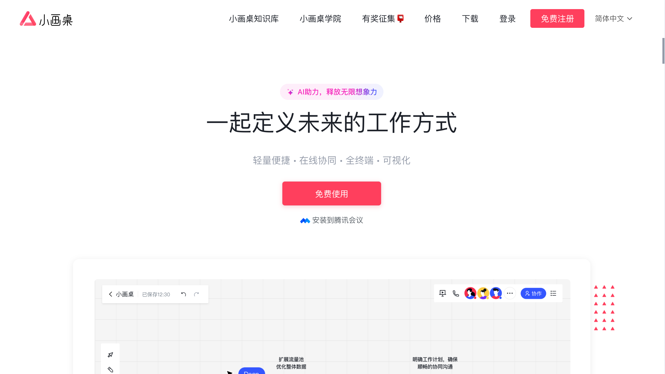 小画桌的官网是 xiaohuazhuo.com。它是北京大麦地信息技术有限公司(也就是知名思维导图工具ProcessOn的团队)推出的一款在线白板。核心就一句话:让团队协作变得看得见、摸得着。你不用安装任何软件,打开浏览器就能用,画布无限大,电脑手机都能访问。它用起来简单,数据传输也加密,很适合现在远程办公或者需要一起琢磨点子的场景,算是国产白板工具里挺受欢迎的一个。个人用的话,免费版基本够使。