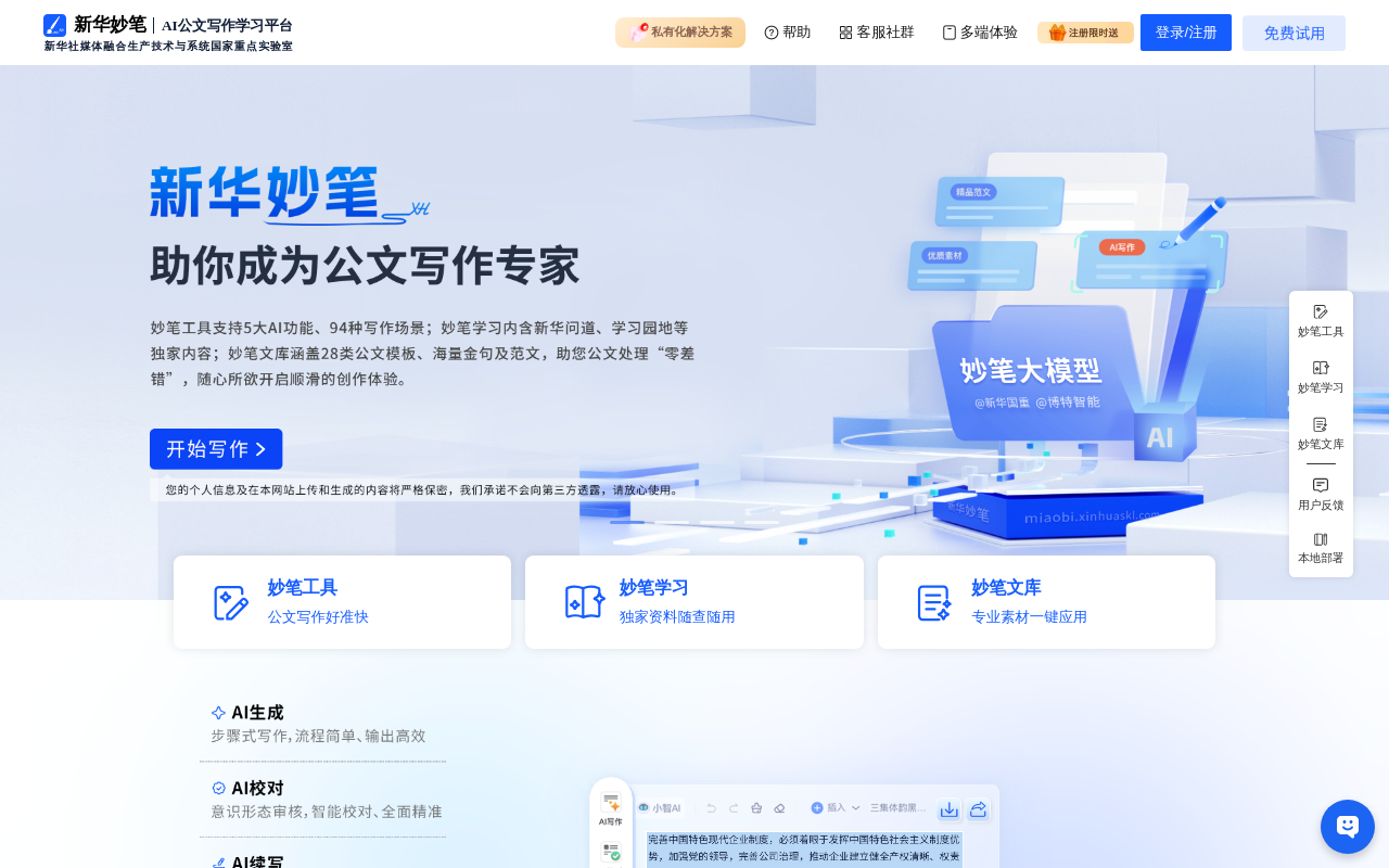新华妙笔是由新华社推出的专业化AI公文写作平台,主要服务于政府机关、企事业单位及个人的公文创作需求。