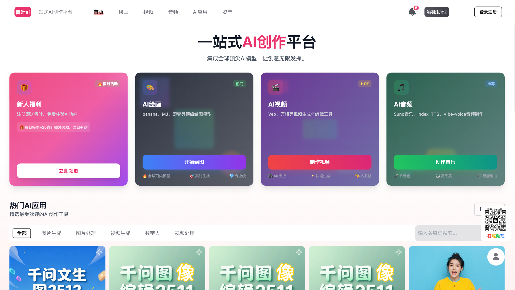 青叶AI是一个把各种厉害的AI模型都搬到一起的平台。你不用再到处注册账号、切换网站,在这里就能玩转图片、视频、音频的AI创作,对新手和专业人士都挺友好。