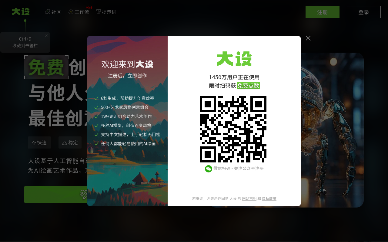 大设网的功能都围绕着“让AI帮你画画”这个主题展开,从生成到学习再到分享,一条龙服务。