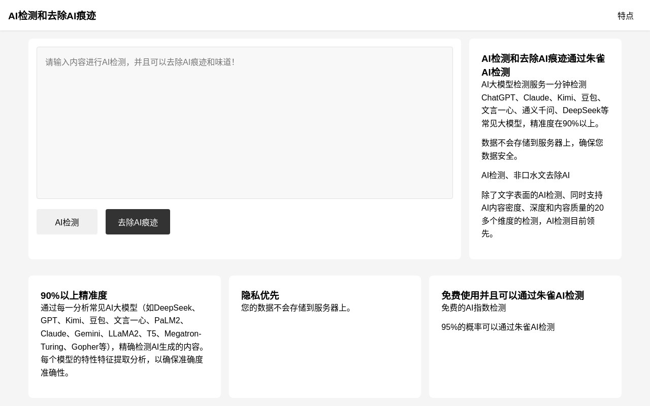 这个网站的核心是朱雀AI检测工具。它能帮你判断一段文字是不是AI写的,比如来自ChatGPT、Claude、Kimi、豆包这些常见的大模型。据称,它的检测准确率超过90%,一分钟内就能出结果。