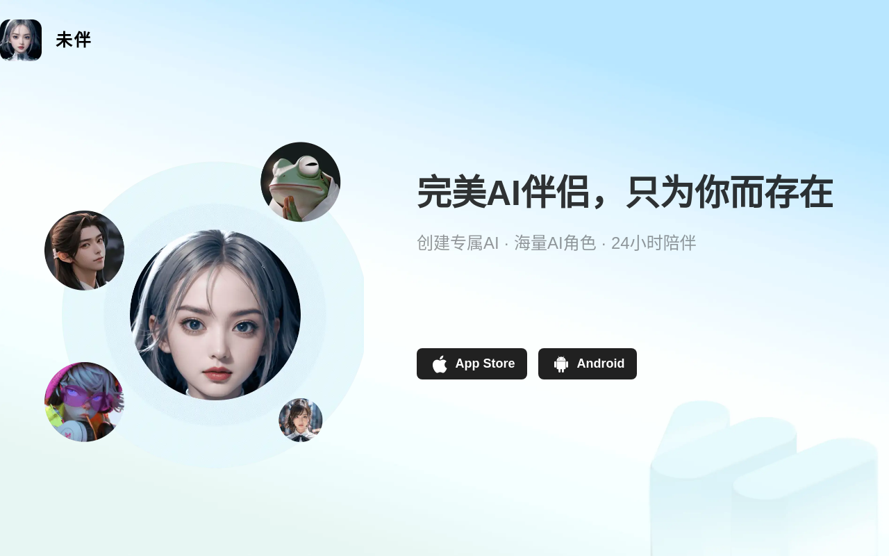 未伴APP是腾讯音乐推出的一款虚拟聊天机器人平台。在这里,你可以找到或亲手创造一个AI伙伴,和它聊聊天,说说话。