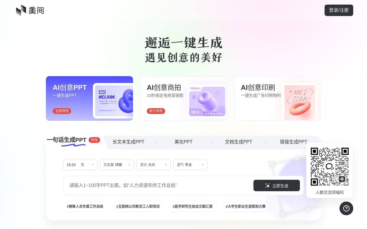 - 用户输入一句话或主题(如“公司年度报告”),即可一键生成包含大纲、内容和配图的PPT。