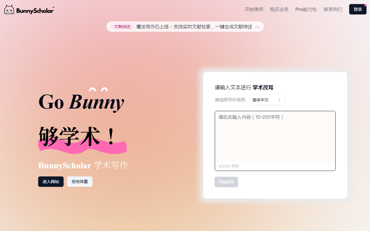 Go Bunny,够学术!百万大学生都在使用的【学术写作】平台,免费降重,报告降重,拟人改写(降AI率)、灵犀翻译、公式识别,一键搞定,轻松学术范!