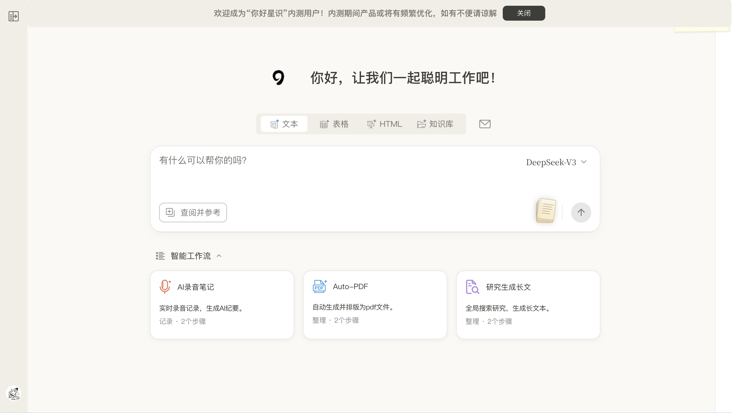 你好星识(HiStella)是新一代AI智能文本工作空间,将知识库、文档、表格、PPT、录音纪要等多种办公功能整合到同一工作空间,无需在不同工具之间来回切换。你好星识支持多种文件格式,能自动组织和索引知识,提供精准的智能问答和多轮对话功能。