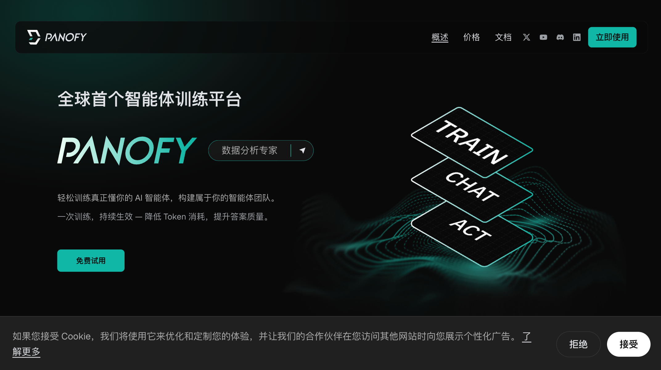 Panofy.ai全球首个AI Agent训练平台(The First Agent Training Platform),由LlamaFactory团队(GitHub 70k+星标,知名开源LLM微调框架)推出。平台核心理念是:不再每次都写复杂Prompt,而是“一键训练专属AI Agent”,让Agent理解你的上下文、品牌声音、工作流程和知识库,训练一次即可长期稳定使用。