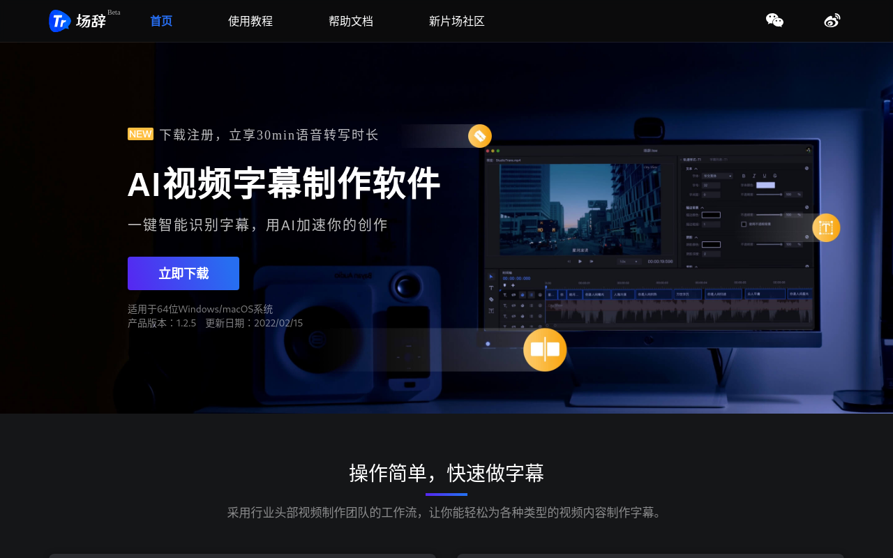 - 下载与安装:访问https://trans.xinpianchang.com/,下载适用于Windows或macOS的场辞软件(版本1.2.5)。