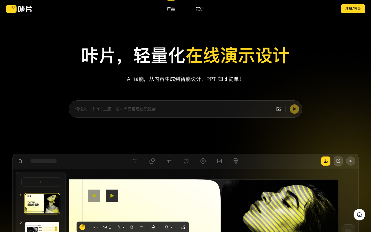 “咔片”(cappt.cc)是一个专注于AI智能PPT制作的工具,核心卖点在于“从内容生成到设计一键完成”。它通过人工智能技术降低了PPT制作的门槛,适合需要高效、高质量演示文稿的用户。如果你有具体的使用需求,可以尝试访问网站体验其功能!