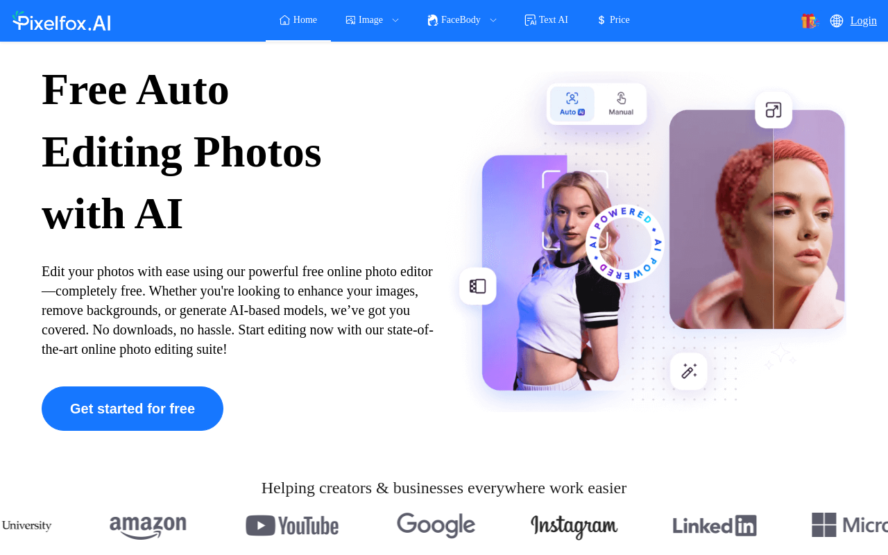 Pixelfox.ai 是一个免费 AI 驱动的在线照片编辑平台,专为用户提供图像修饰、创意编辑和生成功能。其主要工具包括 AI 照片修饰、面部交换、背景移除/生成、对象移除、图像扩展/放大、内补和文本转图像,支持 20 多种风格。操作简单:上传文件或输入提示,即可快速生成结果,无需下载或注册。完全免费,无订阅费用,用户评价其高效自然,适合艺术家、摄影师和内容创作者。但限于图像处理,复杂视频需其他工具。详情访问 https://pixelfox.ai 探索。