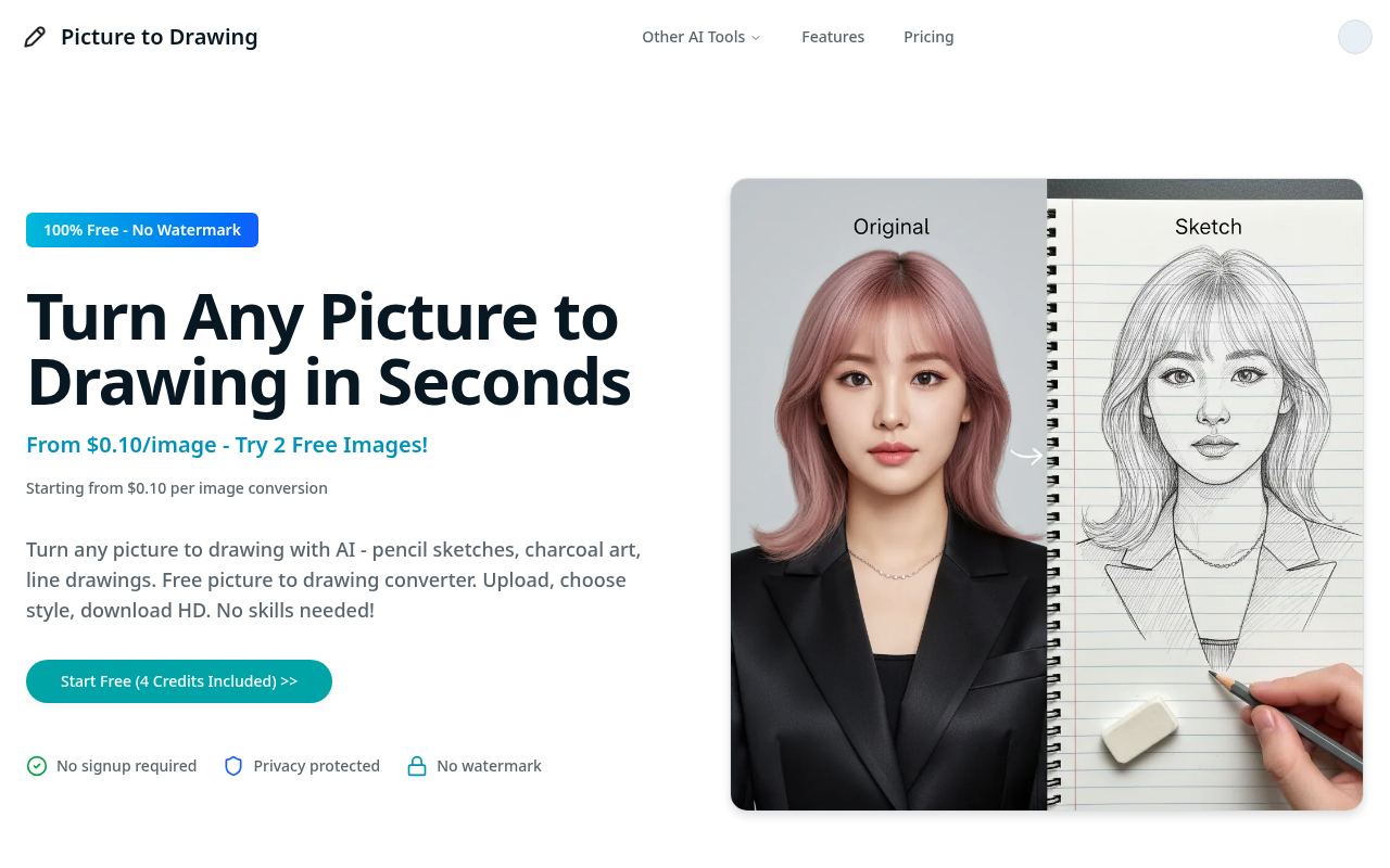 Picture to Drawing AI是一个免费在线AI图像转换工具,专注于利用人工智能将用户上传的照片快速转化为各种艺术绘画风格,如铅笔素描、炭笔画、线稿或笔记本墨水草图。