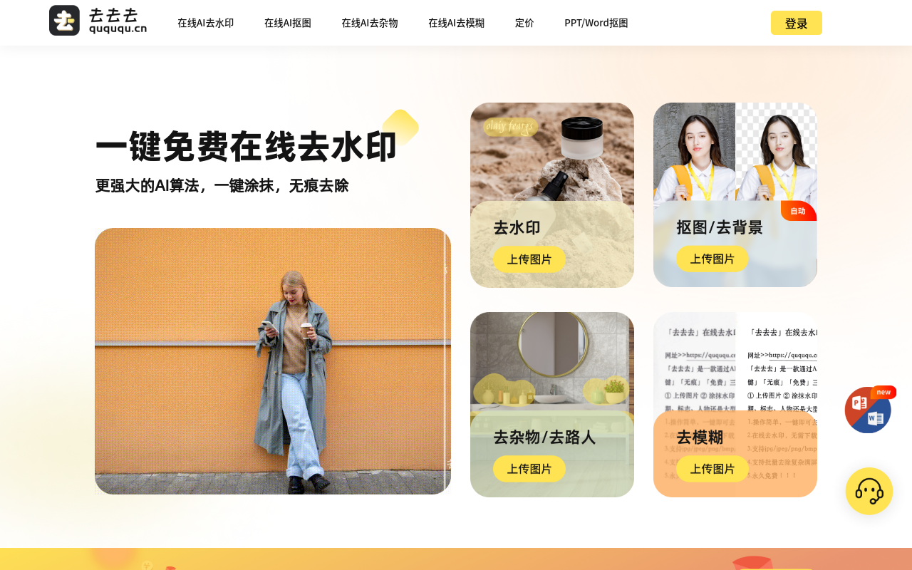 quququ.cn 是一个提供在线去水印和图像处理服务的网站,中文名称为“水印一键去去去”。它主打通过人工智能(AI)技术帮助用户快速、便捷地去除图片、视频或文档上的水印,同时提供其他图像编辑功能,如背景移除(抠图)、证件照制作等。网站定位于免费、易用的在线工具,适合个人用户、内容创作者或需要清理版权信息的用户使用。