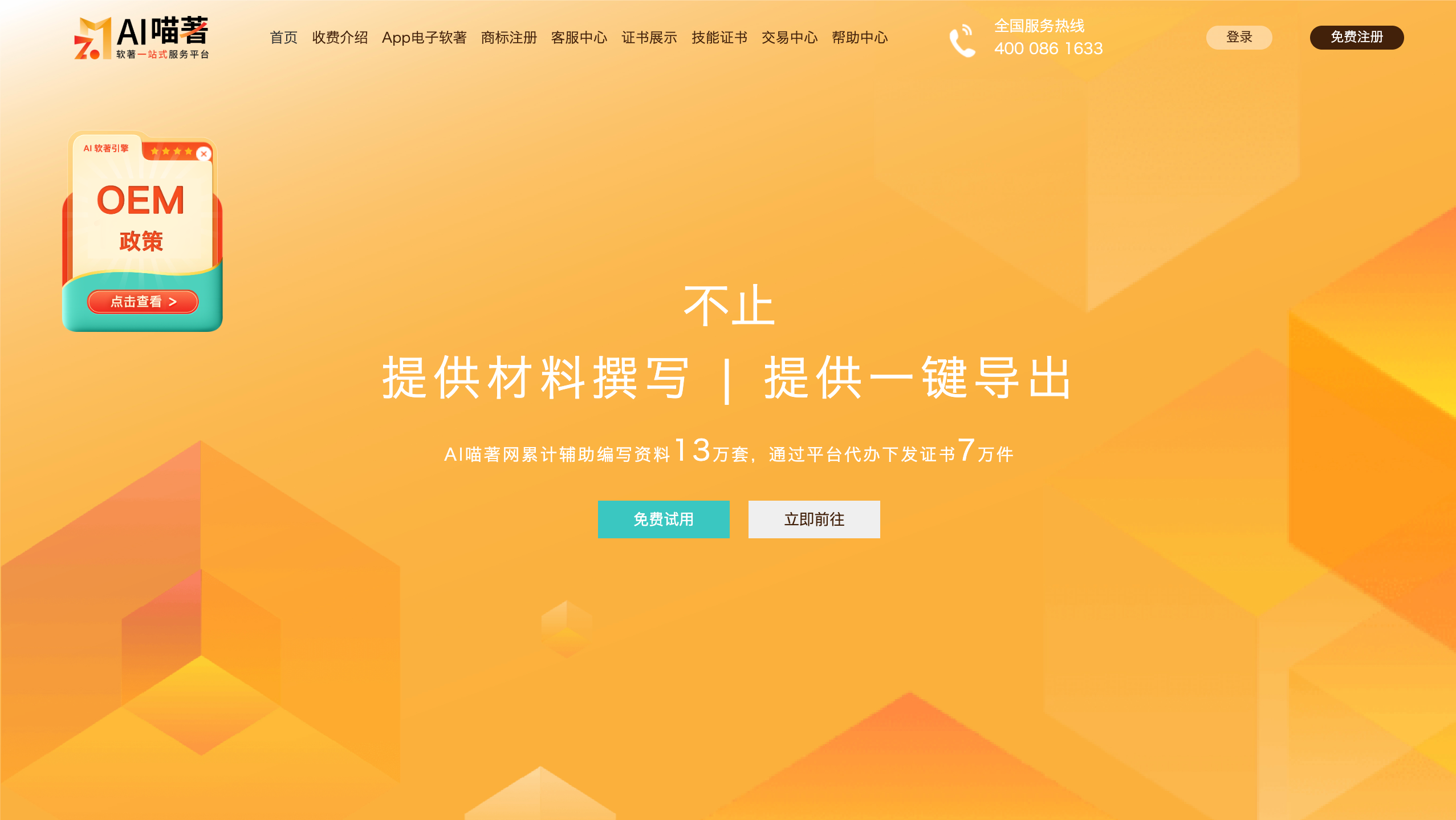 AI喵著网是国内头部垂直AI软著服务平台,聚焦软件著作权(简称“软著”)申报全链路,以“零成本申报+全流程AI赋能”为核心,解决传统软著申请中“材料撰写难、审核通过率低、周期长、成本高”等痛点,覆盖中小企业、创业团队、个体开发者及大型科技公司等多类用户,目前在AI软著申请垂直赛道市场占有率达40%,累计服务超30万用户,处理软著申请材料超18万套,是资本重点关注的AI+知识产权服务标杆平台。