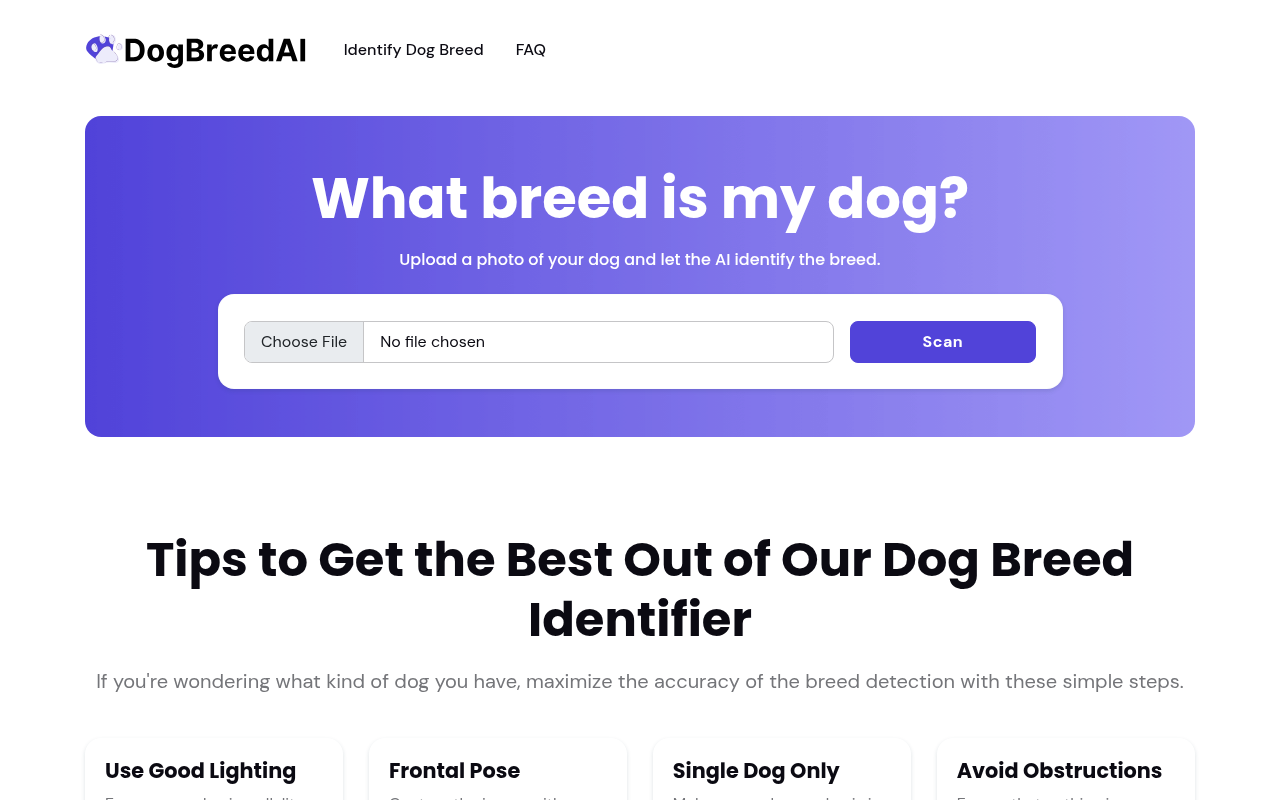 专为爱狗人士、领养机构、宠物新手设计,主打**“零门槛、免费、隐私安全”**。用户无需进行DNA检测,只需上传一张清晰照片,AI即可在数秒内给出基于视觉特征的犬种匹配结果,帮助快速了解狗狗的血统背景、体型倾向及性格特征。