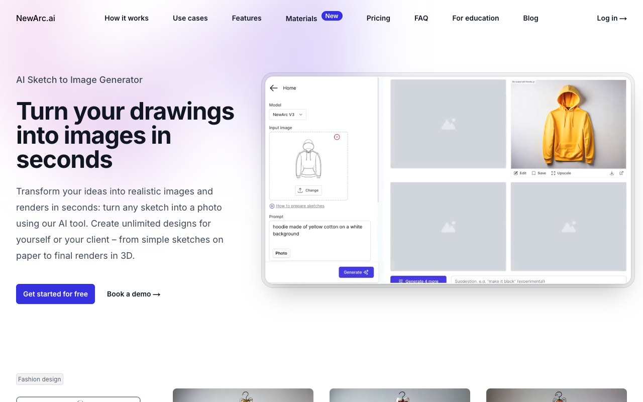 NewArc.ai 是一个人工智能驱动的草图转图像生成平台,旨在帮助设计师、创意人员和教育工作者将手绘草图、插图或照片快速转化为逼真的图像和3D渲染。