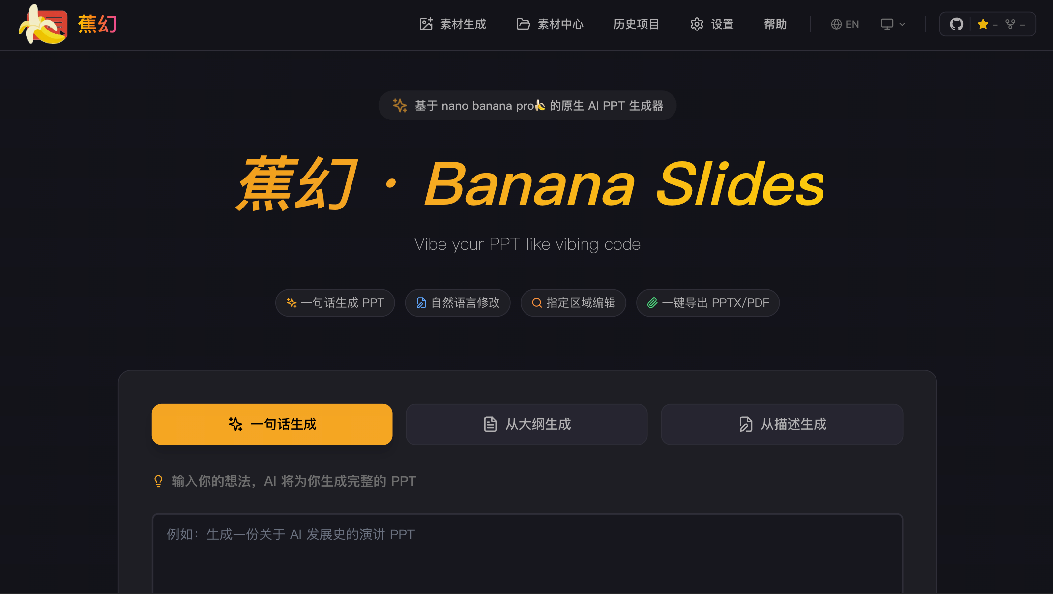 蕉幻开源的AI原生PPT生成工具Banana Slides的官方网站,该工具基于Google nano banana pro🍌图像生成模型打造,核心定位是让PPT制作从繁琐的排版设计回归内容表达本身,通过AI实现从自然语言输入到高颜值、可编辑演示文稿的全流程自动化,彻底解决传统PPT制作耗时、设计门槛高、模板同质化的问题,面向学生、职场人士、教育工作者等所有需要制作演示文稿的用户,支持网页端跨设备使用,也可本地部署。