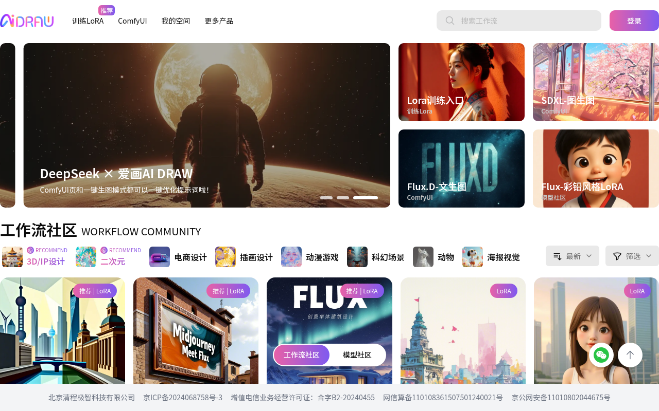 清程爱画是一个AI图像与视频生成平台,拥有超丰富的工作流社区和多种图像生成模式。搭载自研赤兔(Chitu)推理引擎,图像生成速度极快。无需部署即可在线使用最新版ComfyUI、训练LoRA模型。